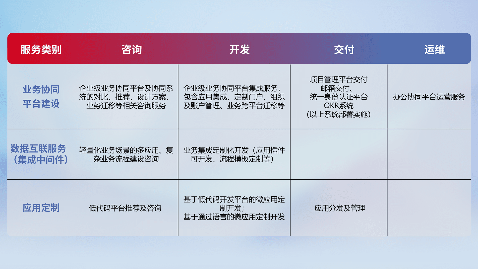 针对钉钉、、企微、、、IDaas等平台级产品提供产品的规划、、、方案、、、、交付、、定制化开发等服务,,实现如统一协同办公、、、、智能客户服务、、混合会议管理、、、、智能数据查询、、、等业务场景,,,,实现数字化转型。。。。